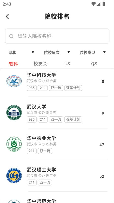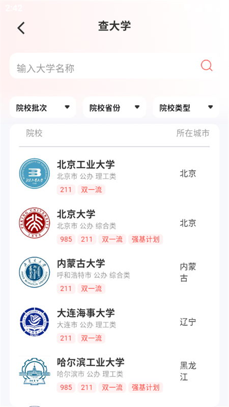 3、点击查大学进入,可以直接输入大学名称进行查询,也可以院校省份、类型进行筛选。