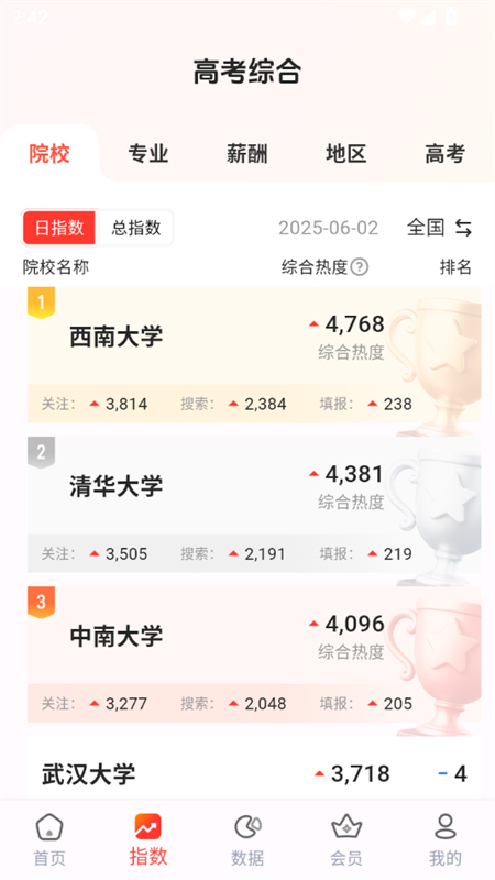 6、进入指数版块,大家可以根据院校、专业、薪酬、地区等条件来查看各种数据指标。