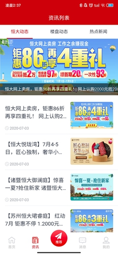 首先打开恒房通app,我们来到首页界面,这里我们可以看到大量的房产信息资源,包括售价以及实景图片和周边配套设施情况。