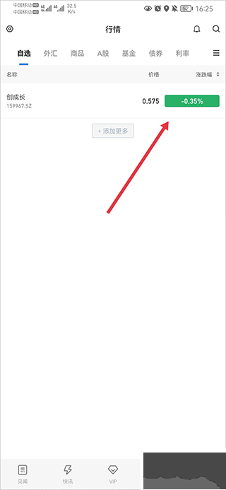 4、然后返回到行情界面后就可以实时查看该股票的涨跌幅情况了
