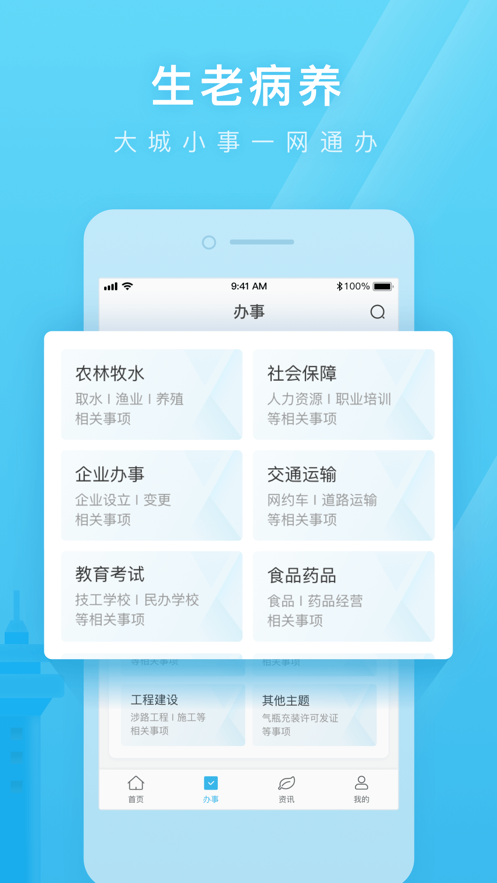 【办事】为市民提供“一网通办”服务,市民可依据办事主题风格,迅速获得需要的办事事项,依据办事手册,开展在线办理。