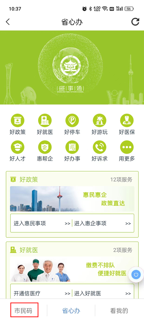 1、下载安装进入到盛事通app页面,点击选择左下角市民码项目。