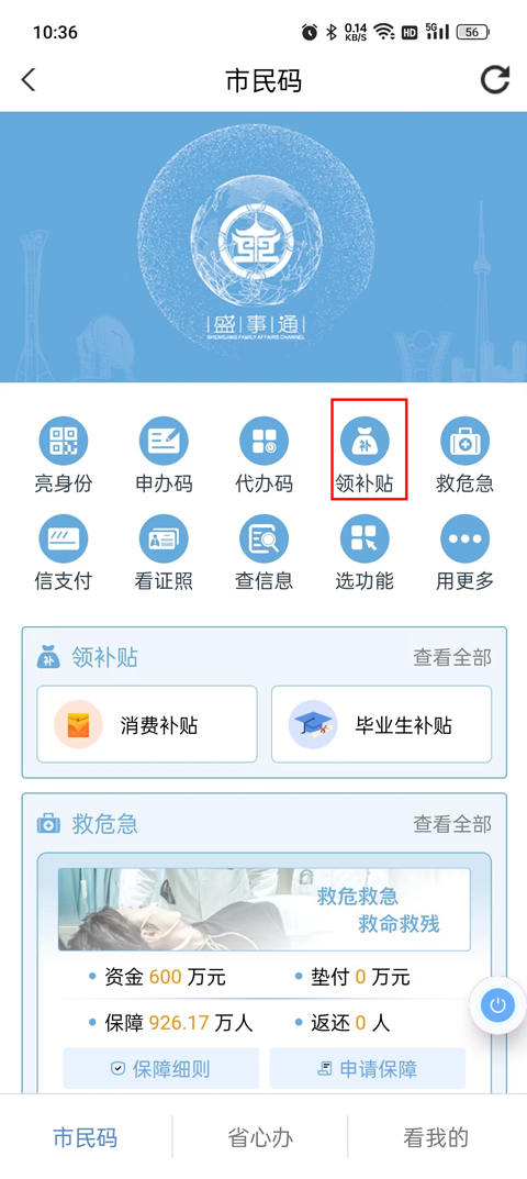 2、市民码页面,点击选择领取补贴。