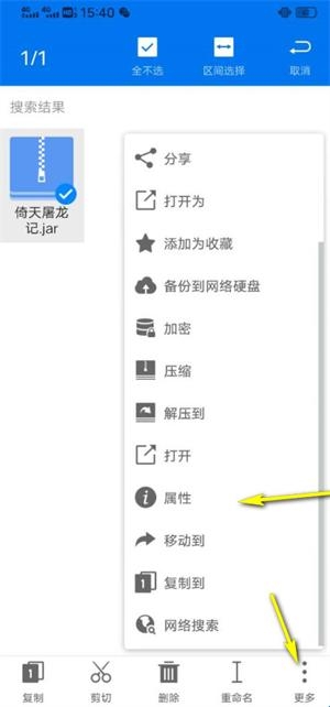 3、接着在【更多】中,点击属性,即可查看.jar游戏文件存放的目录地址。