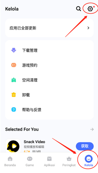 1、首先点击【Kelola】界面内右上角的【设置】选项。
