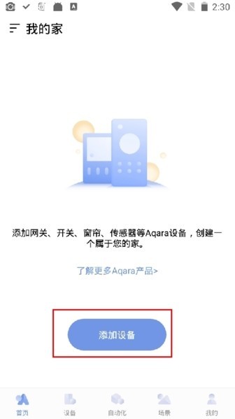 2、在首页,点击“添加设备”按钮,进入设备添加界面。
