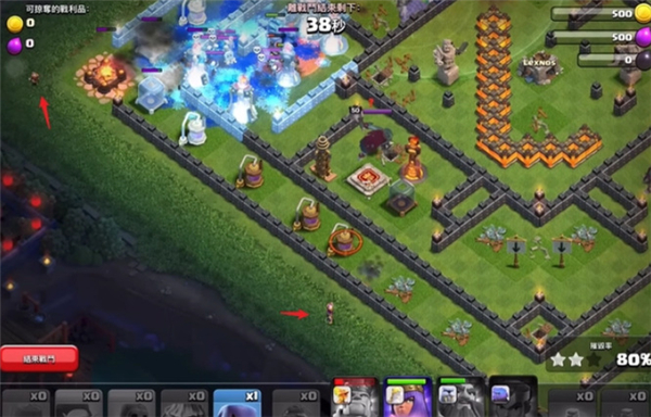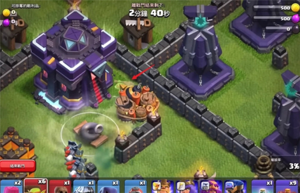 等待援军城堡被打掉后,在靠近城墙一侧下一个超级哥布林引出飓风陷阱,记得要在靠近城墙那一侧下超级哥布林,因为另一侧陷阱超级多。