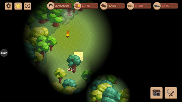3、如下图放置火把就可以照路范围区域,点击右下角的武器选择树木就可以收集资源;