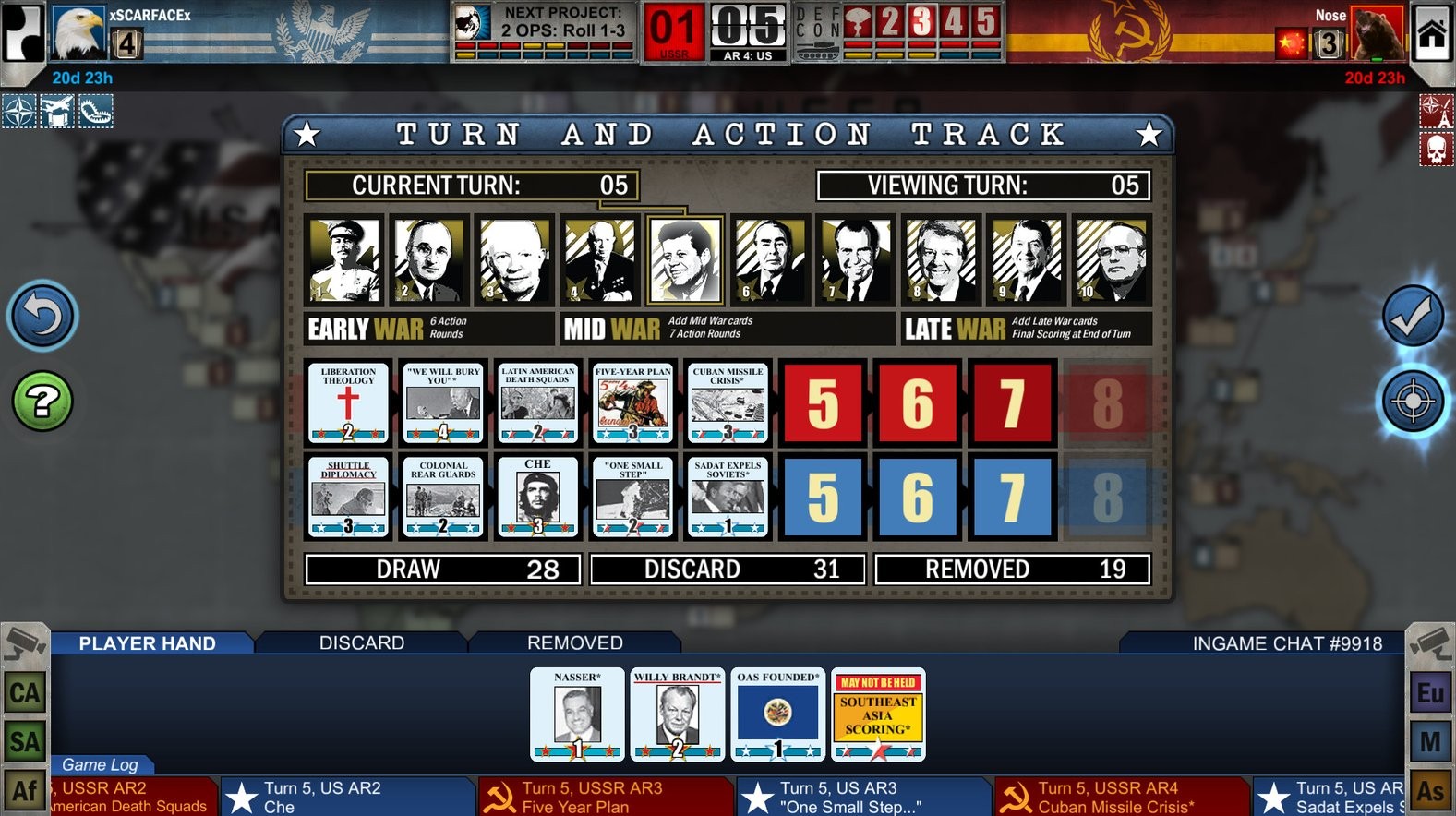 3、注意对方事件。不是每一张对方事件都要飞天的,你可以选择先用点或者先触发事件,这很关键。比如朝鲜战争,美国可以先发生事件,如果没打中,刚好2op变成3-0,打中了,也是2-1。又比如阿以战争,先用点进黎巴嫩或者埃及,一方面可以让打中的概率减少1/6,就算打中了,还有机会回以色列。