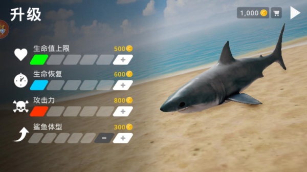 故而,游戏前期的核心策略在于全力积攒金币。玩家凭借积累金币,能够循序渐进地提升鲨鱼咬合力、加速度等重要属性。就拿咬合力来说,首次升级需耗费1200金币,其他属性的升级规则也大致相仿。不过,每次游戏获取的金币数量较为有限,一般最多仅有200左右。这并非是玩家能力欠佳,而是因为鲨鱼等级与各项属性还未得到提升,玩家在游戏过程中得时刻提防各类危险,所以很难积累到大量金币。
