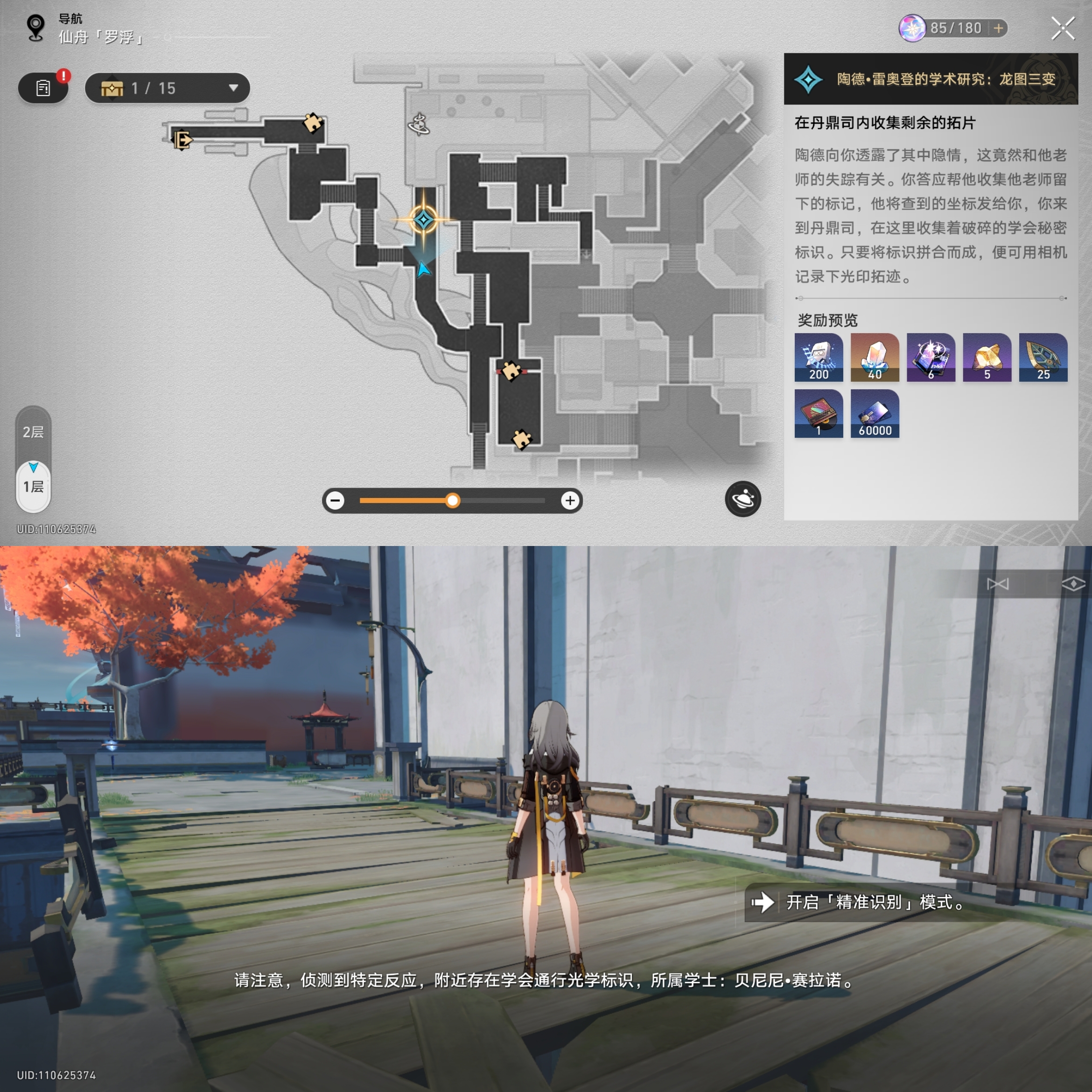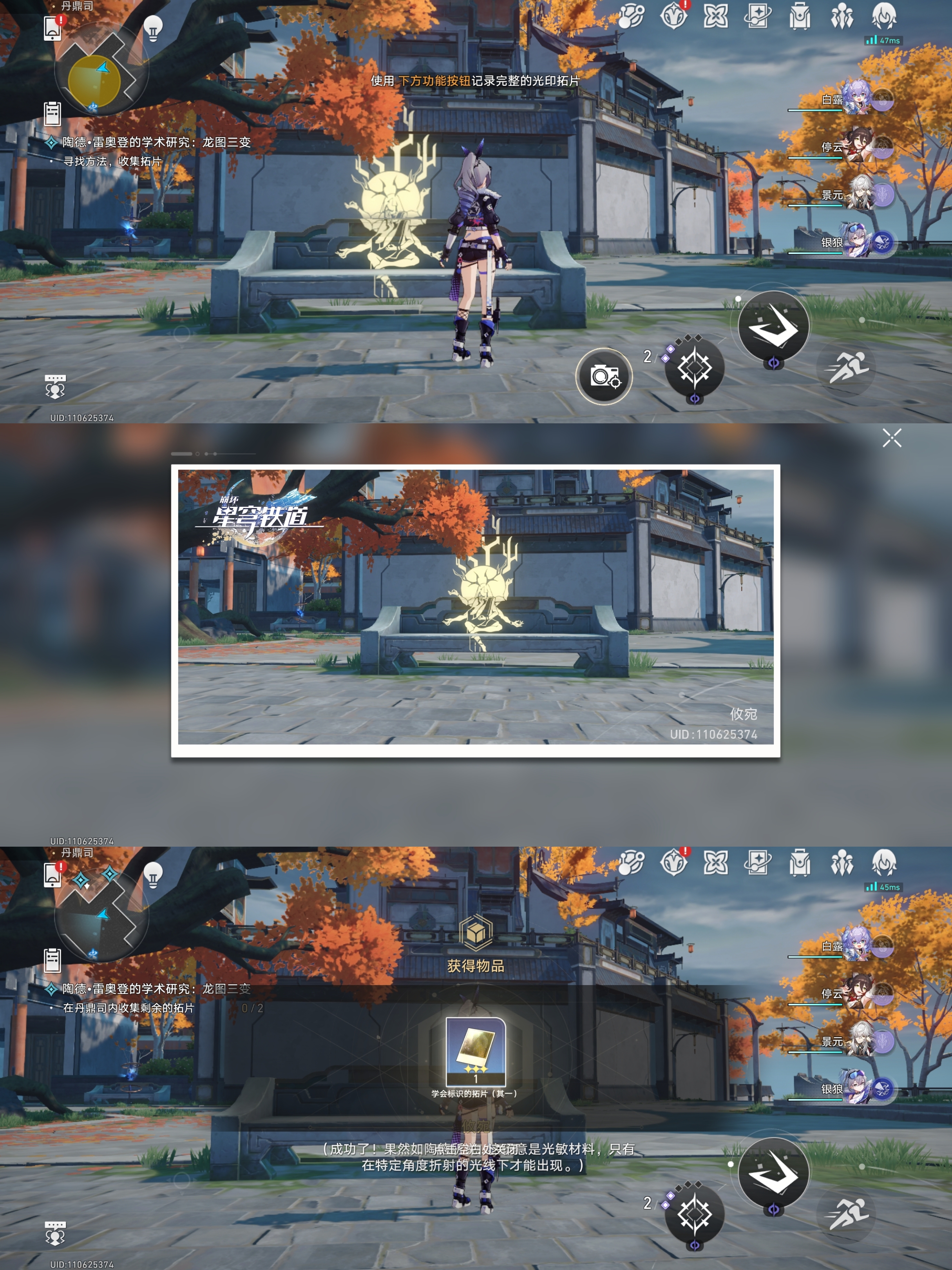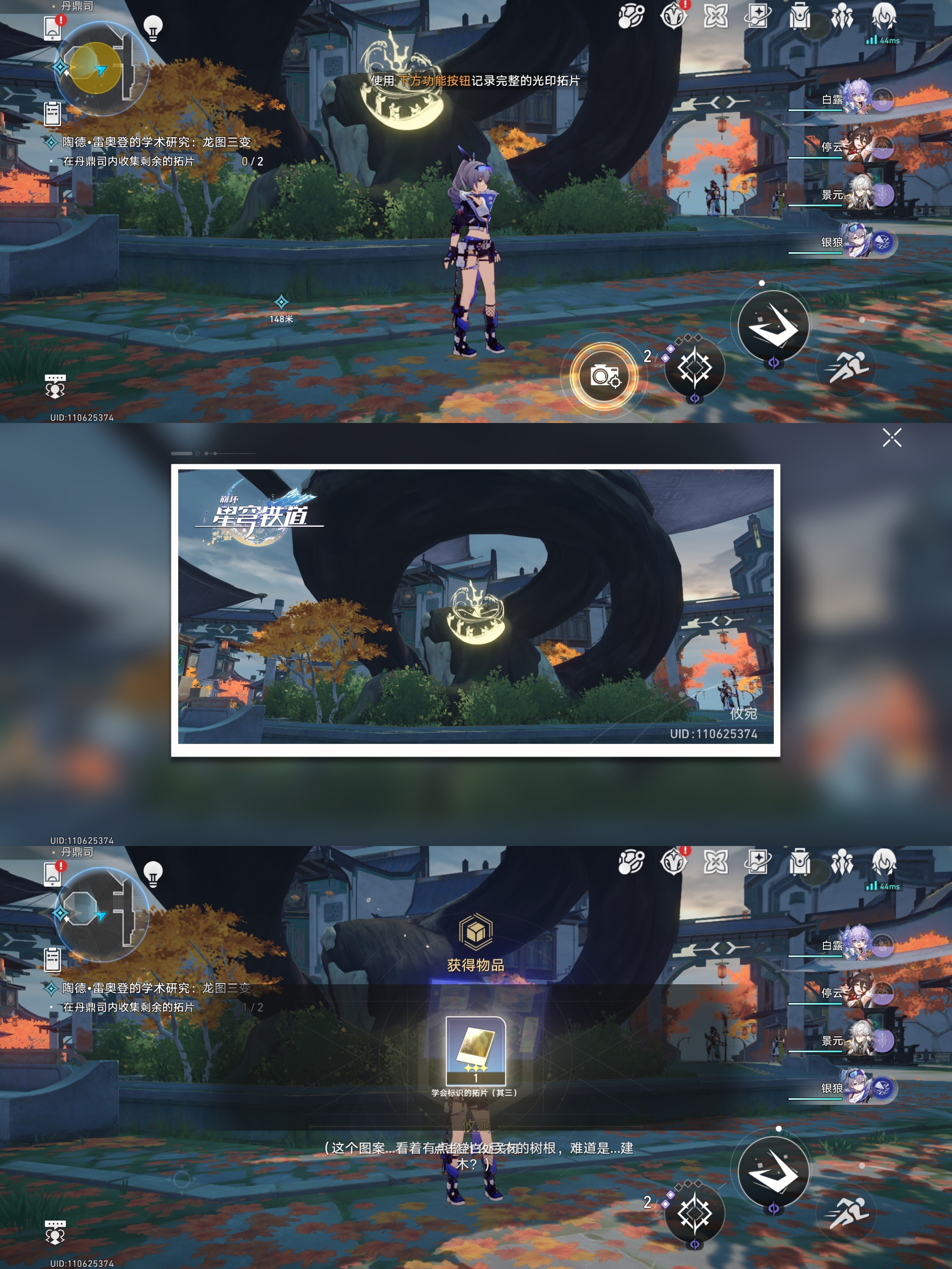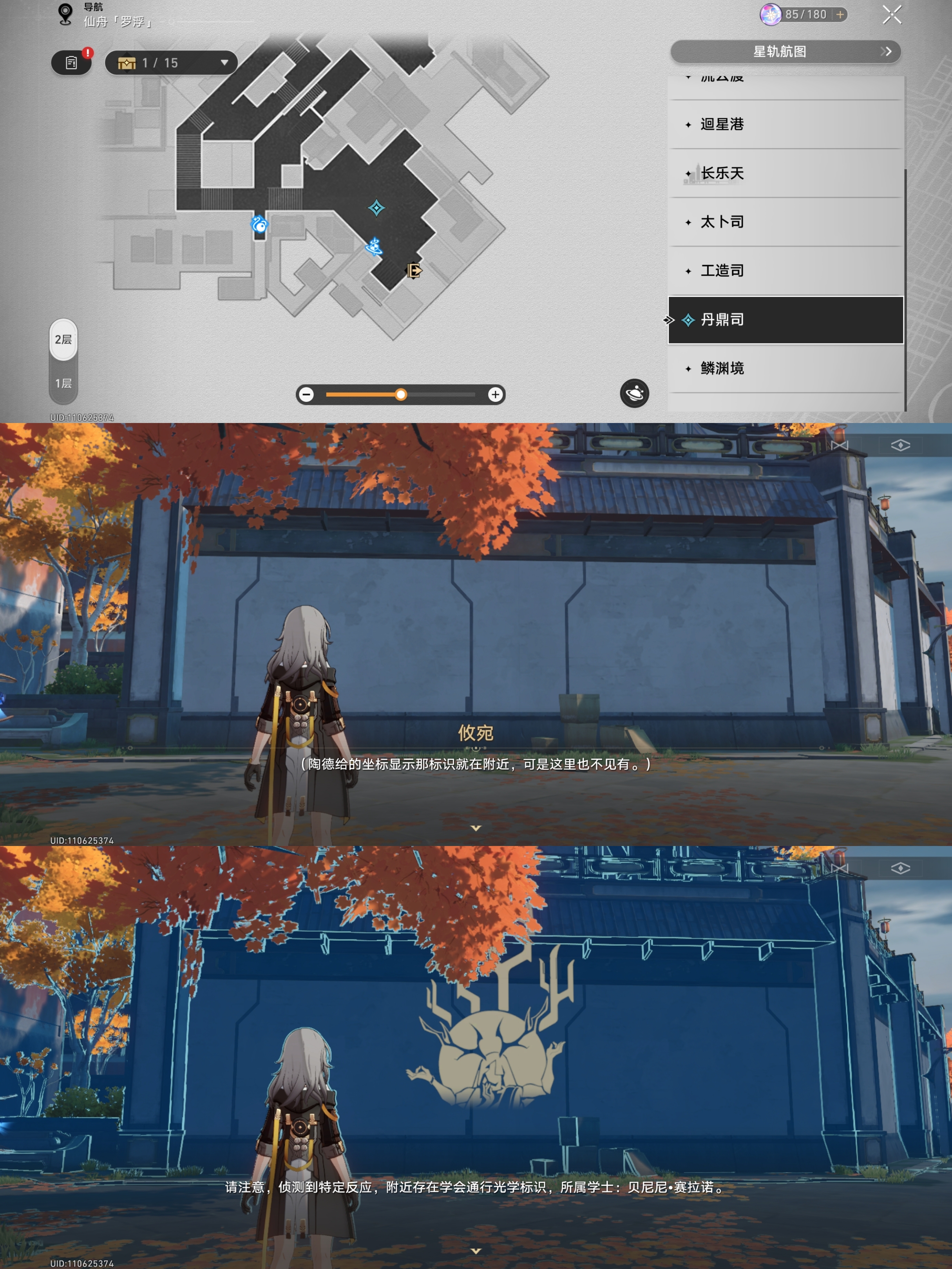 对话完成后会指引我们到丹鼎司寻找三处标识我们来到第一处如下位置进行识别(尽量选用矮一些的角色,如银狼、白露、虎克),获得学会标识的拓片:其一
