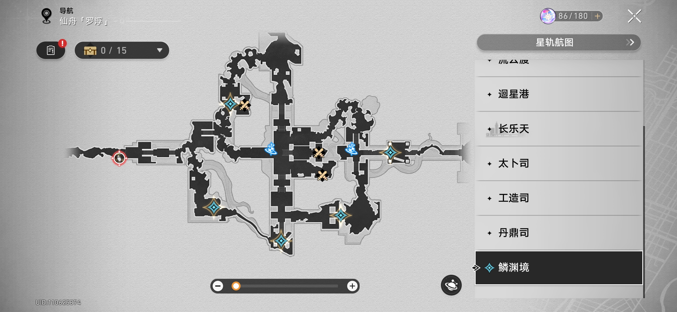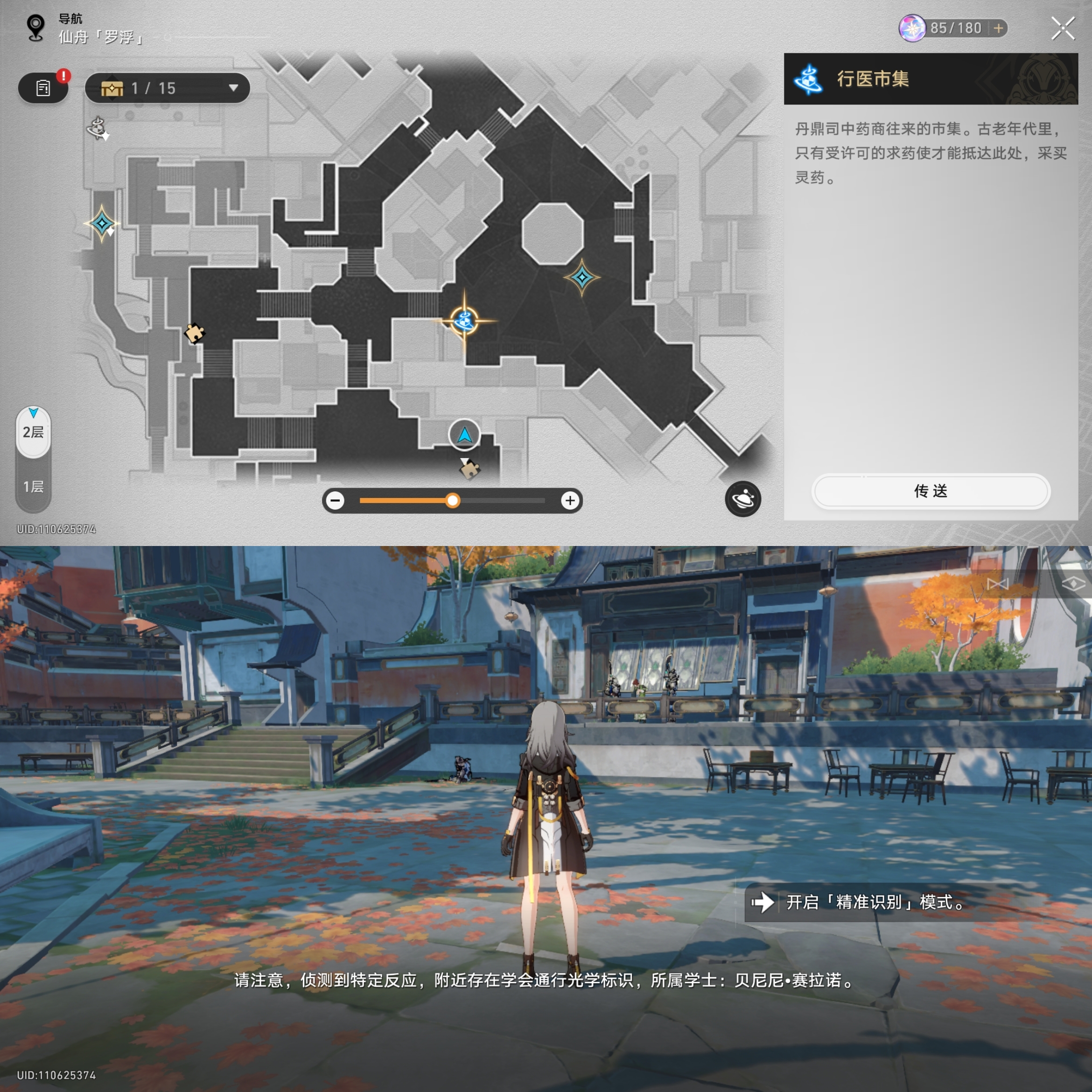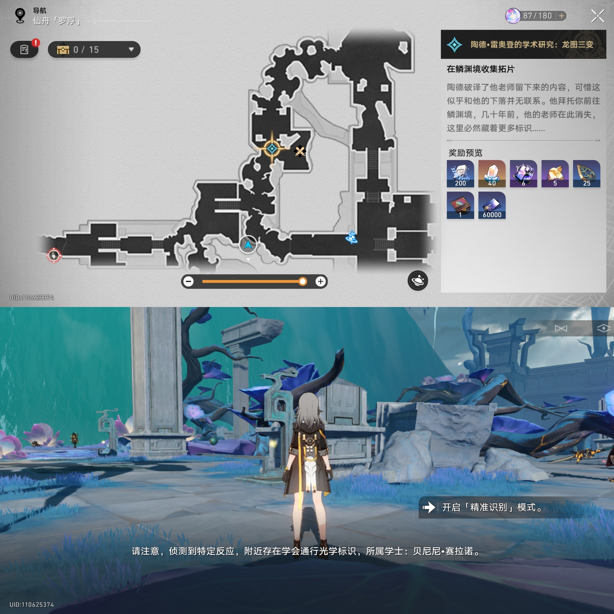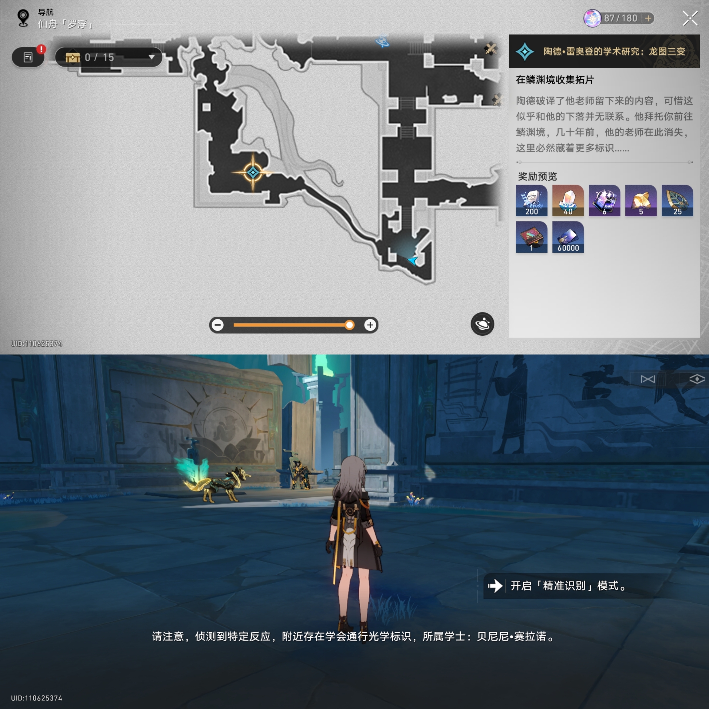 对话完成后会指引我们到丹鼎司寻找三处标识我们来到第一处如下位置进行识别(尽量选用矮一些的角色,如银狼、白露、虎克),获得学会标识的拓片:其一