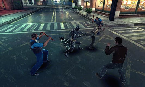 蝙蝠哥回来了,上来就是个救人行动,滑翔下去解决三个罗罗,救出年轻夫妇(这里开始便新加入个蓝衣服拿着钢管的敌人,会防御,最好方法是用招架反击,如果不行,在按拳过后用跳跃键跳到敌人背后,在开始攻击,很有效的破防)。