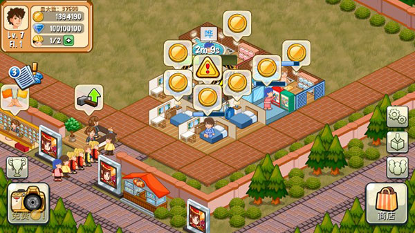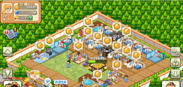 3、比如客人消费后显示的金币点击后就可以收取,或者如果有足够金币后,在前台就会出现一个向上的箭头点击后就可以升级,或者点击不同的建筑设施,可以对其进入旋转,升级等等,非常简单。