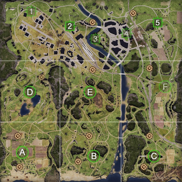 所有前线地图都有三行。前两条线由攻击者必须捕获的1×1公里部门组成。未分离的第三行是进攻方的主要目标:大型枪炮塔。