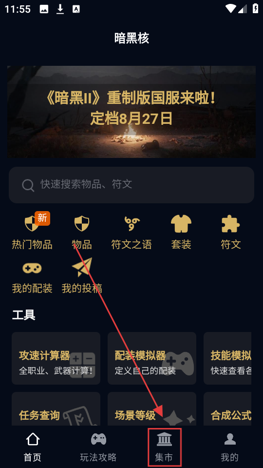 1. 在暗黑核的首页,点击【集市】按钮,就能进入集市页面,进而查看物品交易相关信息。
