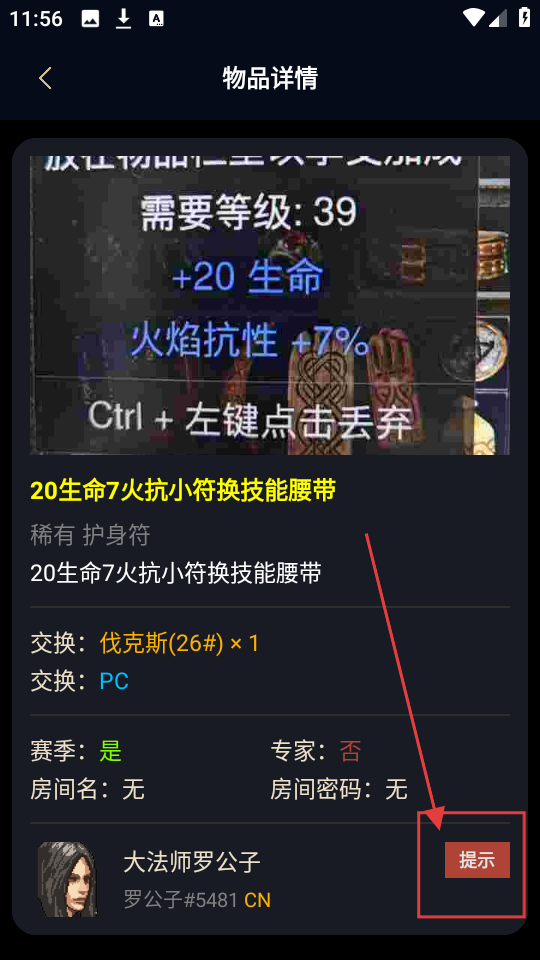 3、点击物品进入详情页面,随后点击【提示】,就能查看物品交易的相关提示信息。