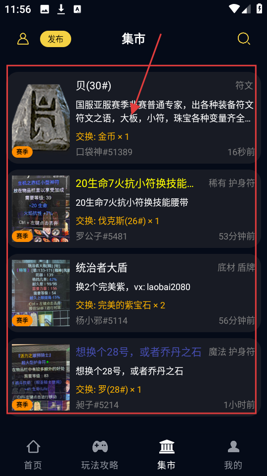 2、当您进入集市页面,便能瞧见各类物品的交易信息,像符文、护身符之类,挑选您感兴趣的物品即可。