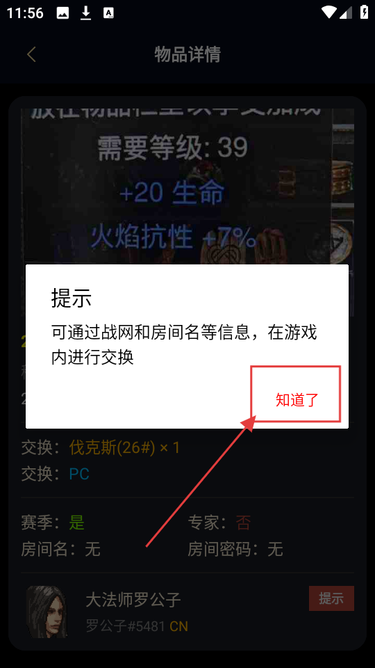 4、在查看提示信息之后,点击【知道了】,就能关闭提示弹窗,进而继续开展物品交易操作啦。