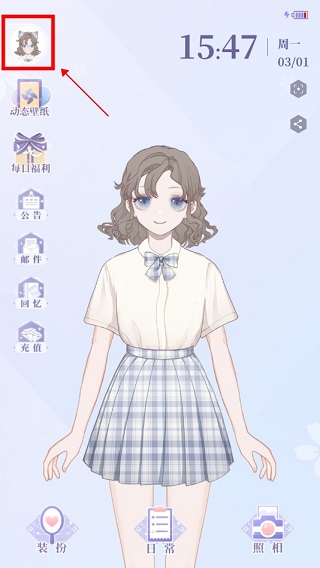 之后将正式进入次元世界,软件界面类似于手机主界面的操控,其中左上角显示的是当前时间,下方的功能则是:装扮、日常和照相。点击“装扮”就可以换上自己喜欢的衣服哦~点击“日常”可以陪你一起学习养成好的习惯~点击“照相”就可以为自己喜欢的装扮拍照哦!甚至还能可以下载成专属于你的头像、壁纸呢!