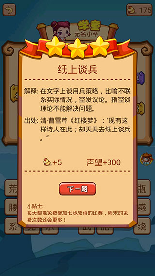 4、成功答对的话就可以成功过关并获取成语解析。
