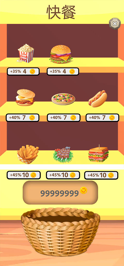 3、小编这里以“快餐”为例,进入后可以购买汉堡、披萨以及爆米花等很多好吃的快餐食品。