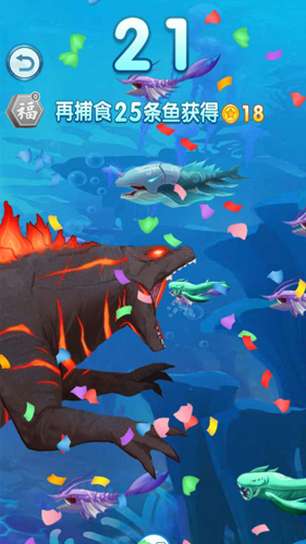 随着玩家的角色不断成长,可以尝试挑战比自己体型更大的鱼类;如果成功吞噬它们,能够获得更多的成长和奖励;