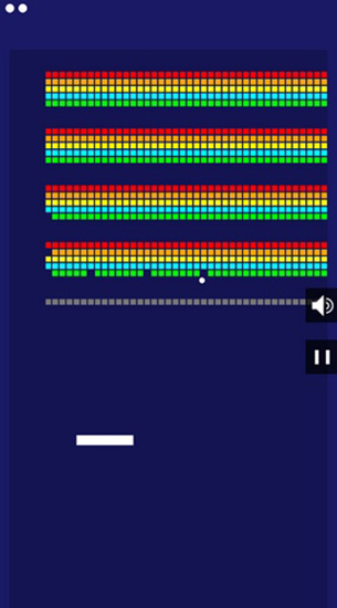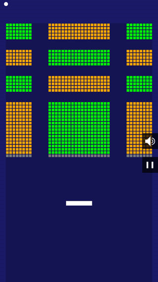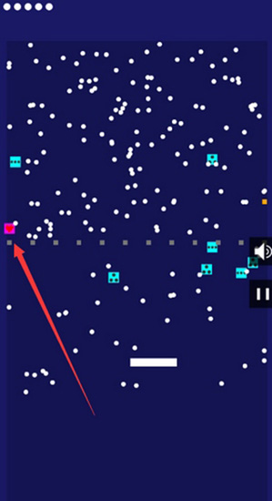 1、玩这个游戏的时候,玩家需要操控一个横条去使小白球反弹从而毁灭一块块砖块,那么怎么才可以把所有的方块打完呢?技巧在于把小白球打到两排方块的中间,例如下图,会使它掉不下来,会一直在上面反弹!