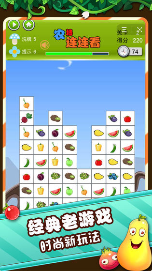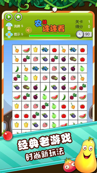 一、经典模式:连连看经典的玩法,固定时间内消除完所有的蔬菜水果就算过关。