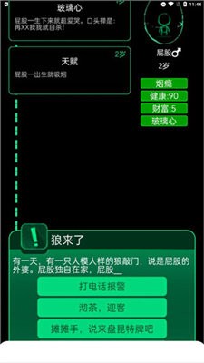 黑暗的背景和简单的屏幕,绿色和白色的字体,没有任务系统,你需要在游戏中完成,只有不同的人生阶段可供选择。