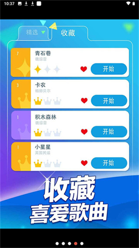 ①选择一首歌曲开始,界面会出现四个赛道,每个赛道会随歌曲的乐谱出现黑色的钢琴键,从上向下移动,点击钢琴键就会发出音符的声音,连续点击成功,音乐就会流畅的播放出来。